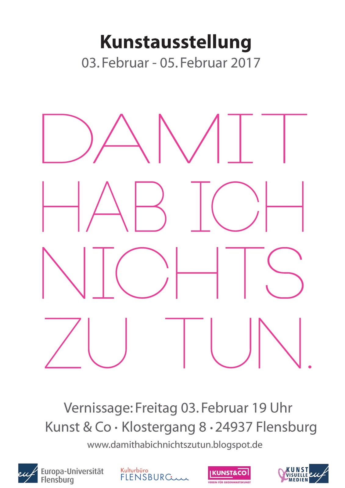 „Fünf Studierende des Master Studiengangs Kultur-Sprache-Medien an der Europa-Universität Flensburg kuratieren im Rahmen eines Kunst Seminars unter der Leitung von Prof. Dr. Manfred Blohm eine Kunstausstellung mit dem Namen „Damit hab ich nichts zu tun“.