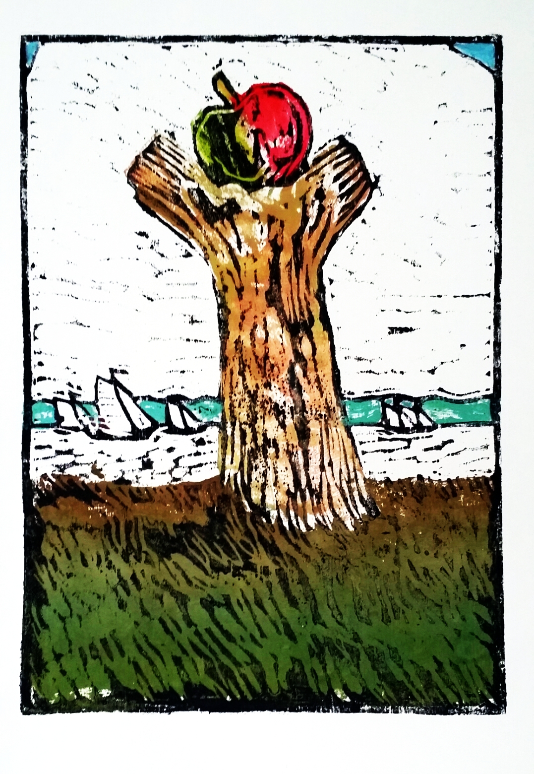 Titel: „Big Apple“ Künstler: Johannes Caspersen Technik: 4 Farben Holzschnitt Papier: dorée,120 g, naturweiß Maße Bild: 32 cm x 45 cm Maße Papier: 43 cm x 61 cm Auflage: 50/50, signiert, datiert Preis per Blatt: € 80,–