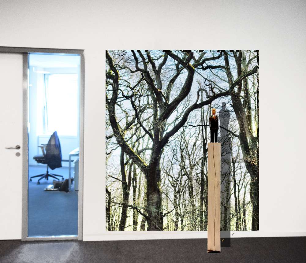 Installation : Manager auf Eichenstehle mit Print im Hintergrund.