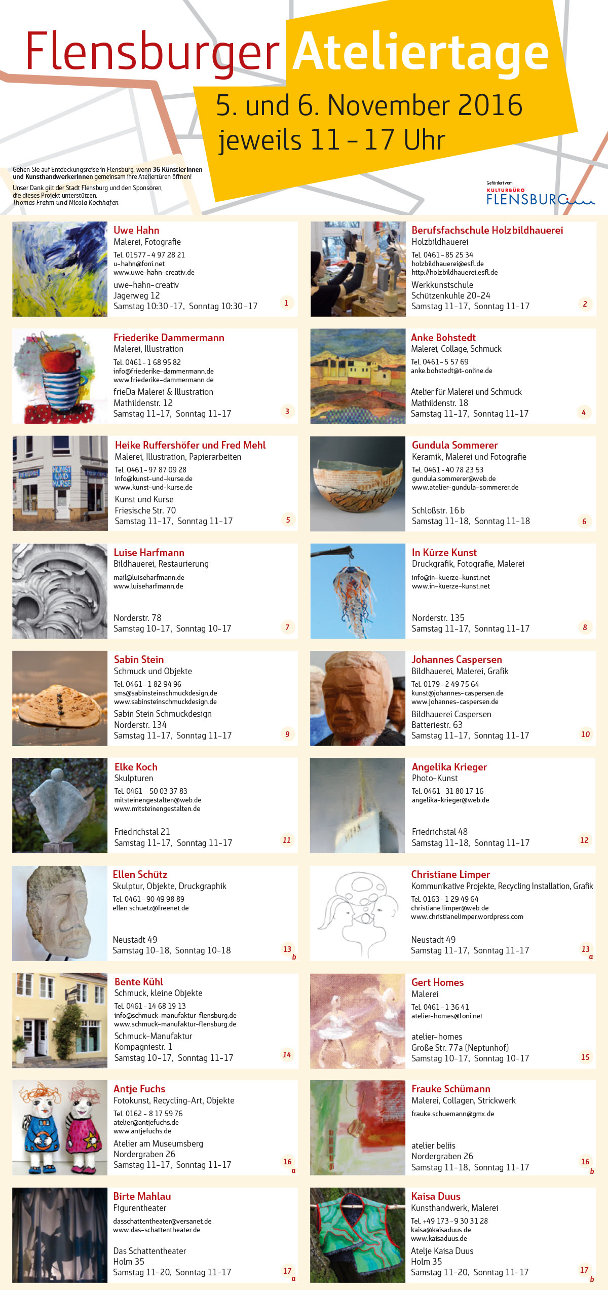 Dank der Initiative des Kulturbüro Flensburg, findet Anfang November 2016 zum zweiten Mal der Tag des offenen Ateliers statt. Ich & 35 andere Künstler haben zugesagt. Kommt vorbei, ich freue mich!