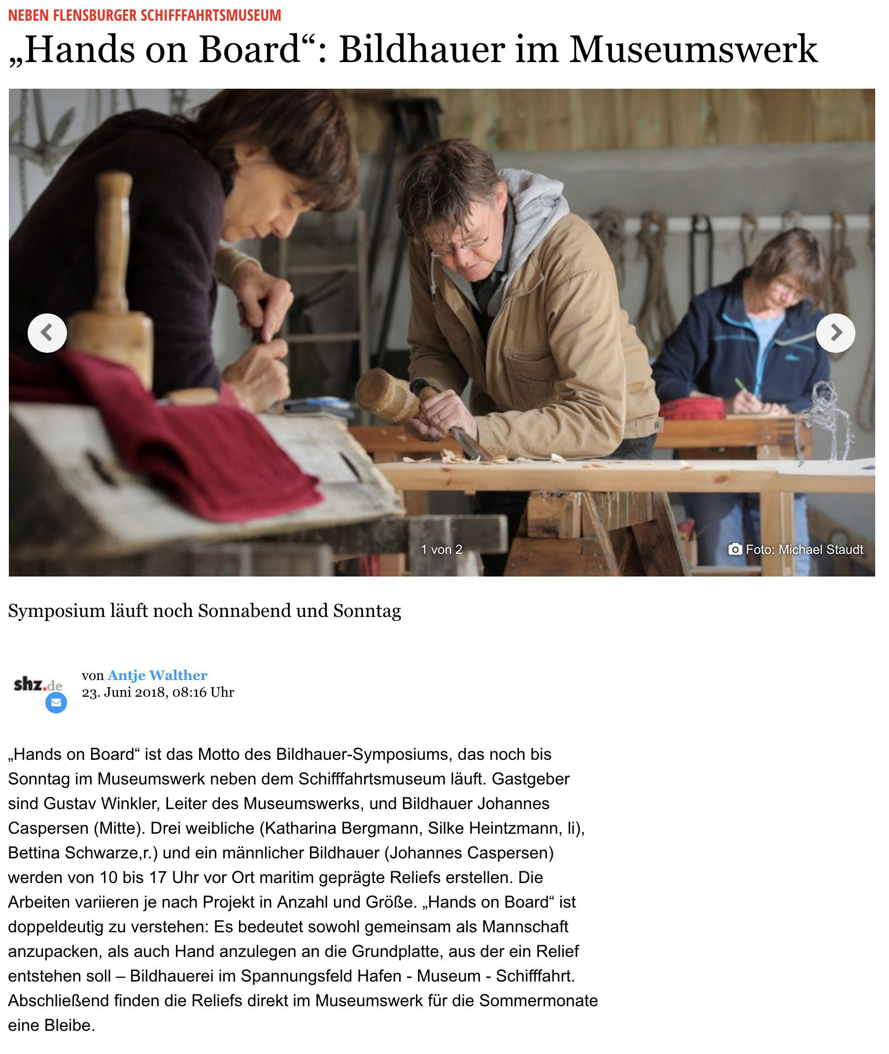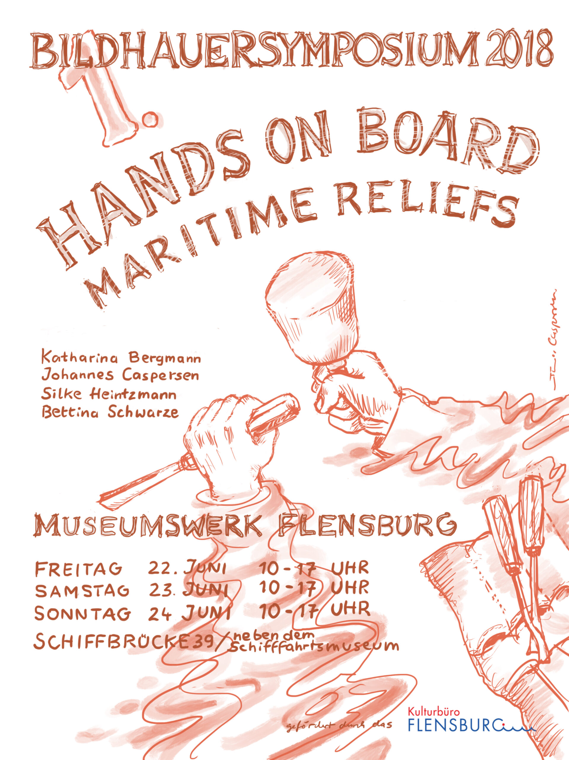 „Hands on Board“ ist das Motto des Bildhauer-Symposiums, das noch bis Sonntag im Museumswerk neben dem Schifffahrtsmuseum läuft. Gastgeber sind Gustav Winkler, Leiter des Museumswerks, und Bildhauer Johannes Caspersen (Mitte). Drei weibliche (Katharina Bergmann, Silke Heintzmann, li), Bettina Schwarze,r.) und ein männlicher Bildhauer (Johannes Caspersen) werden von 10 bis 17 Uhr vor Ort maritim geprägte Reliefs erstellen. Die Arbeiten variieren je nach Projekt in Anzahl und Größe. „Hands on Board“ ist doppeldeutig zu verstehen: Es bedeutet sowohl gemeinsam als Mannschaft anzupacken, als auch Hand anzulegen an die Grundplatte, aus der ein Relief entstehen soll – Bildhauerei im Spannungsfeld Hafen – Museum – Schifffahrt. Abschließend finden die Reliefs direkt im Museumswerk für die Sommermonate eine Bleibe.