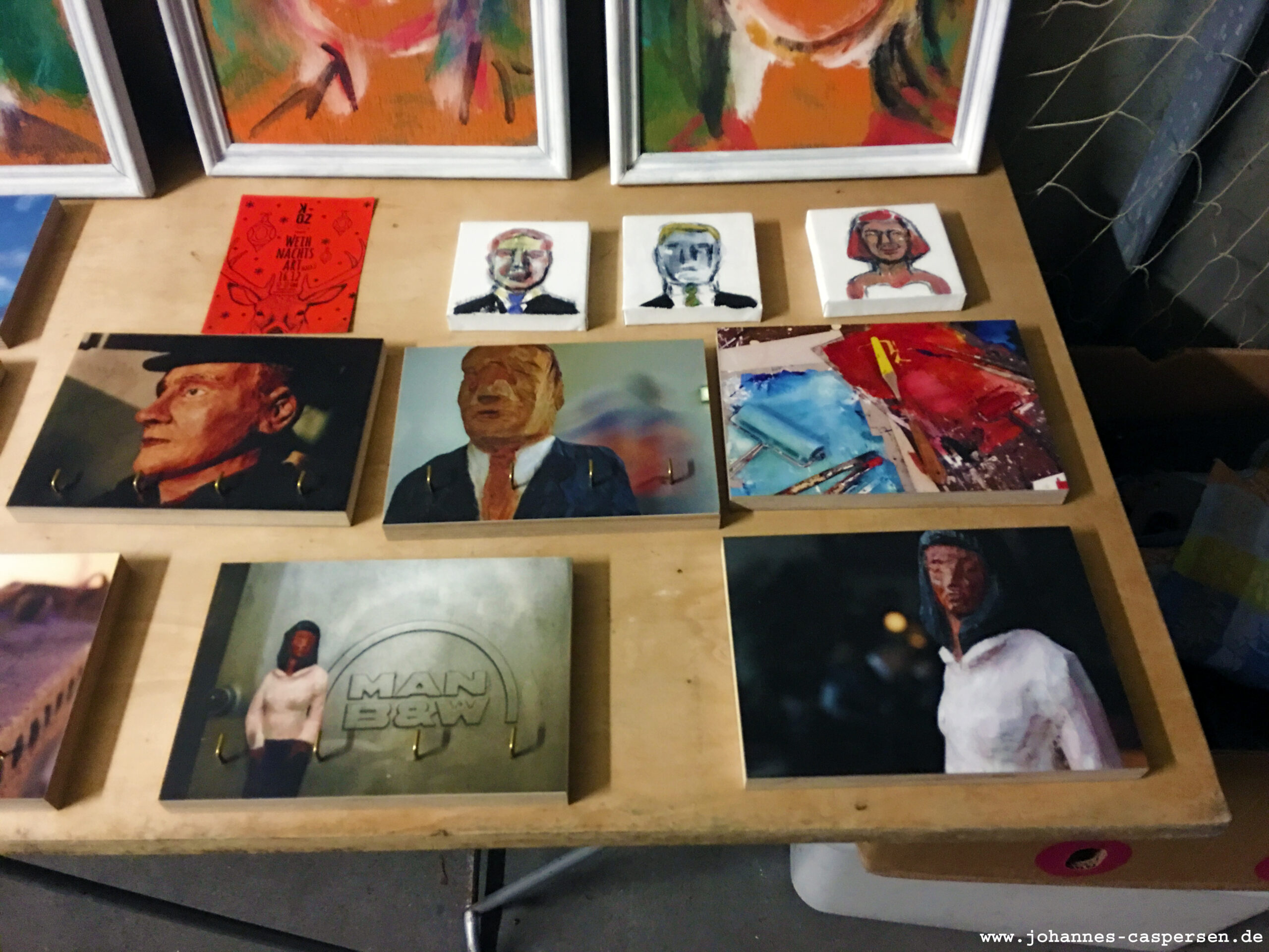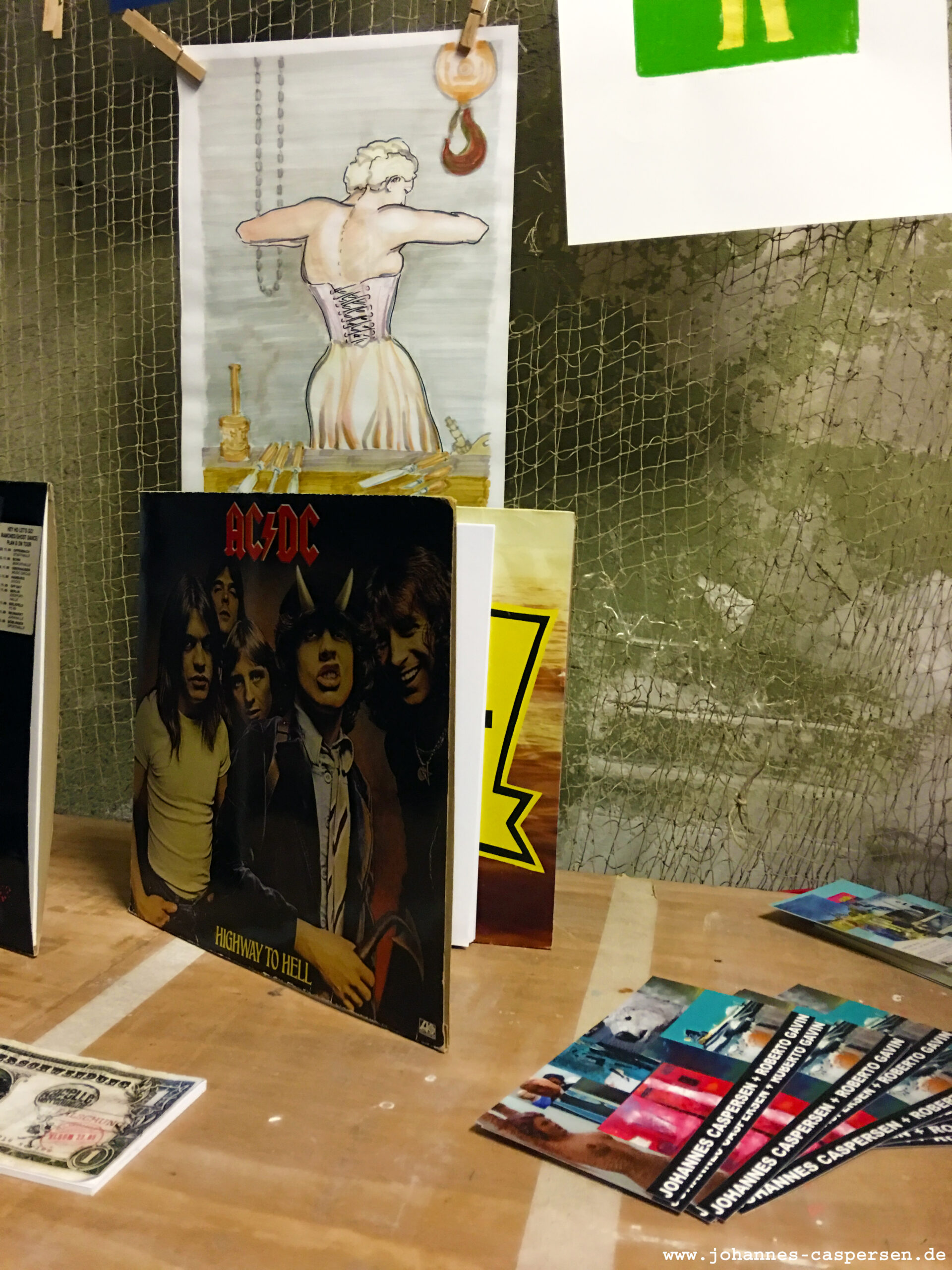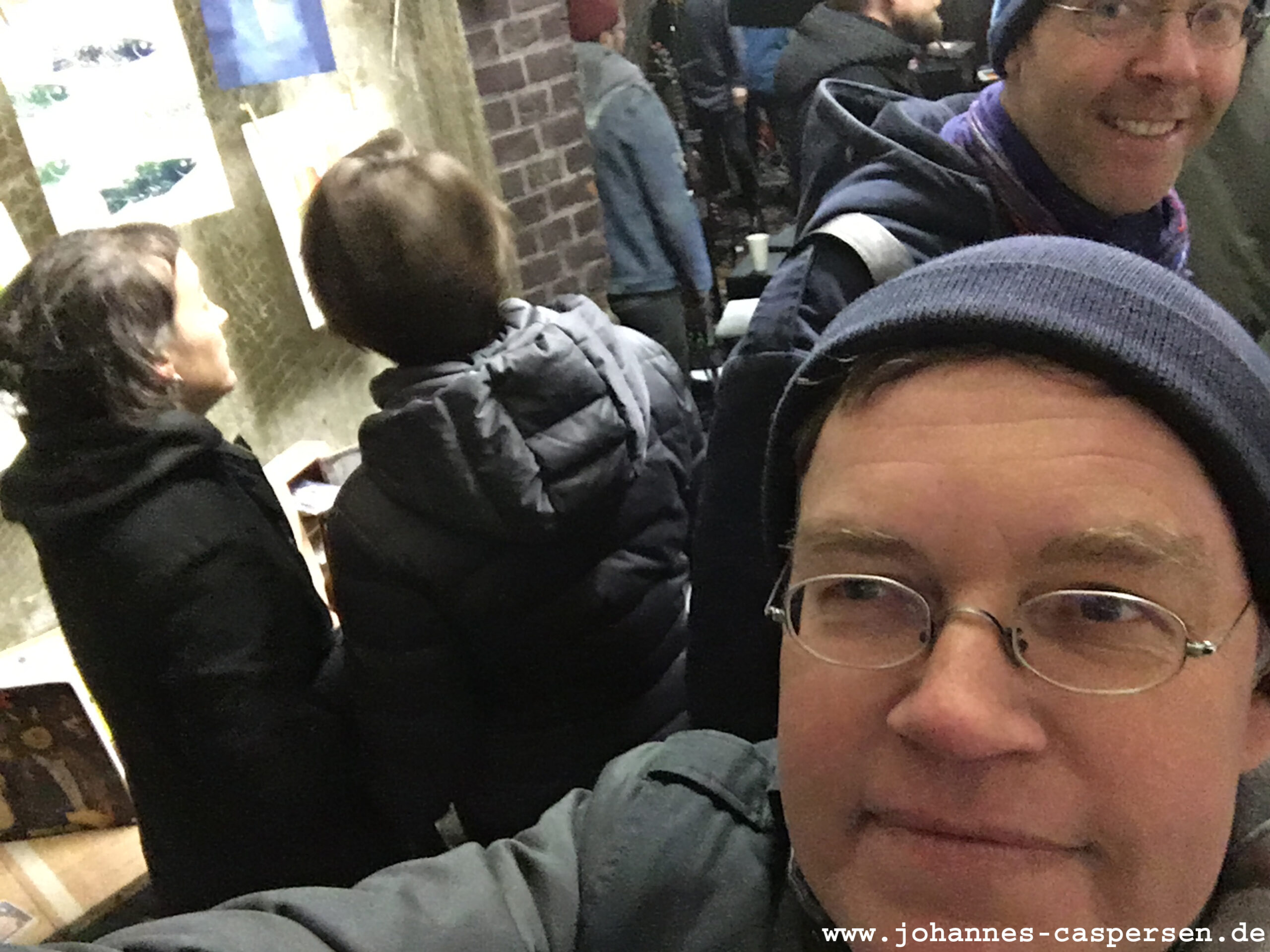 Ja man, das war mal wieder ein echt toller Markt, dort beim grünen Jäger neben der K-OZ Galerie, in den Katakomben der Sauerberg- Garagen! Schnell aufgebaut, improvisiert, Mega gefroren und eine Menge Spaß gehabt! Neben den Holzschnitten, Akrylbildern und Skizzen boten wir auch aus unserer Upcycling Collection jede Menge gepimter Plattencover und Konzertkarten mit Abreißblöcken an. – Nach der Kürbissuppe kam dann der Brownie mit dem Kaffee und wo dann doch die Kälte so langsam die Füße zu Eis werden ließ, kippten wir dann noch den einen oder anderen Hot- Mojito oder Apfel- Punsch und sangen mit der Band „Feliz Navidad“.