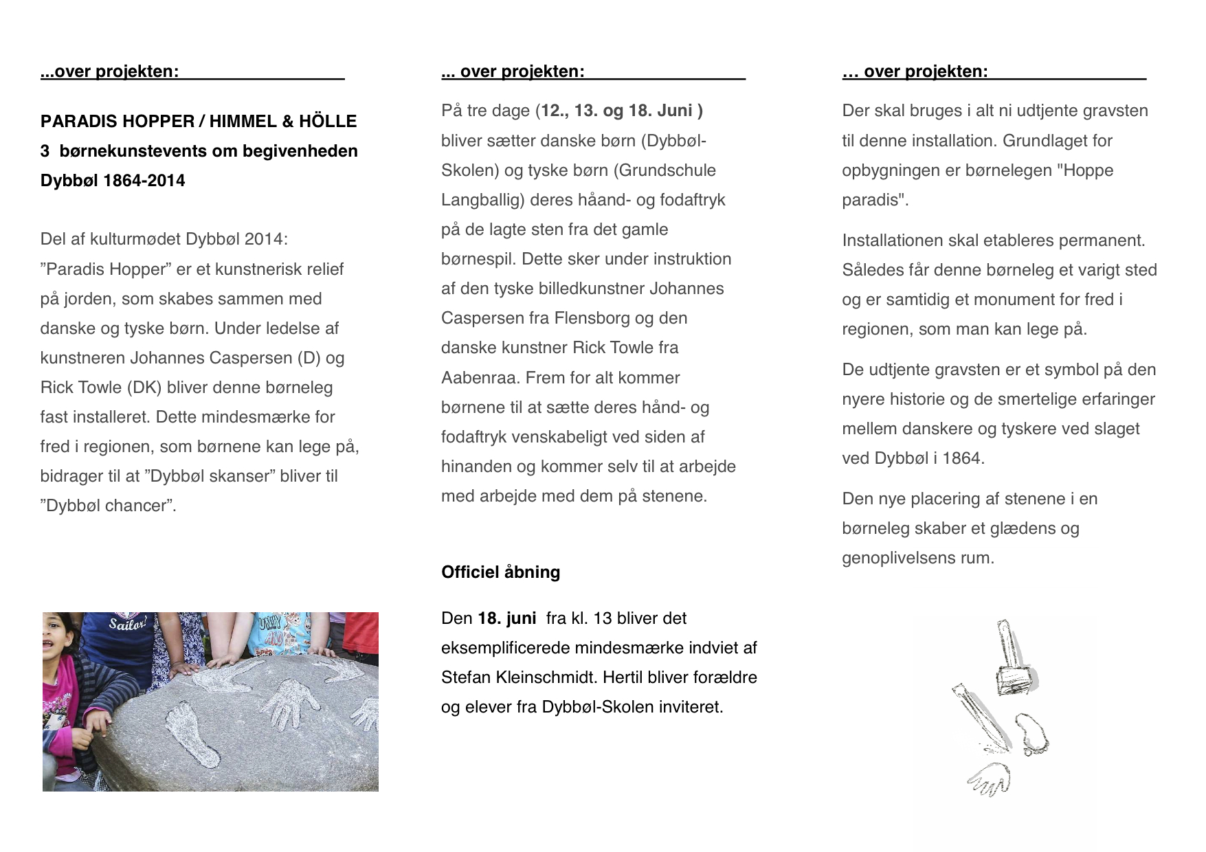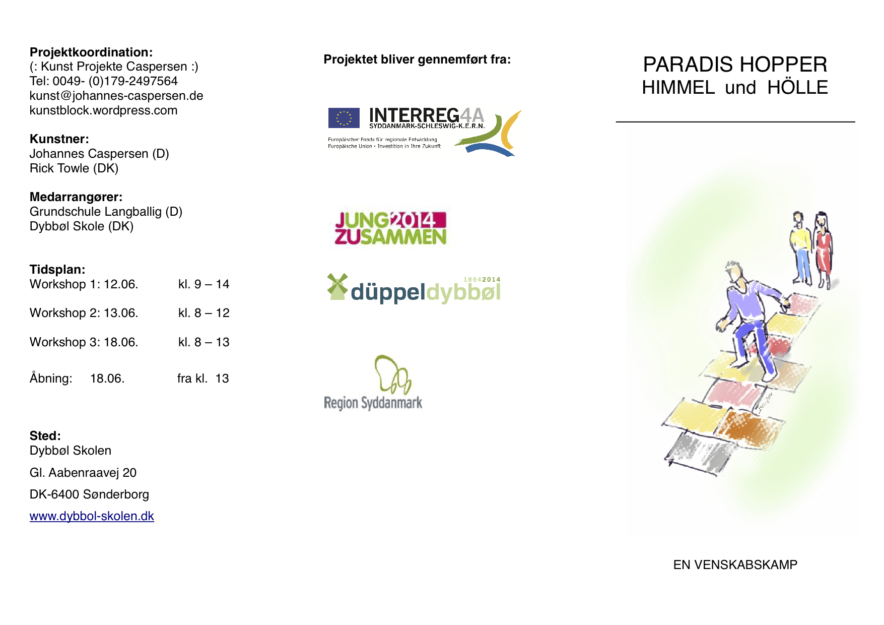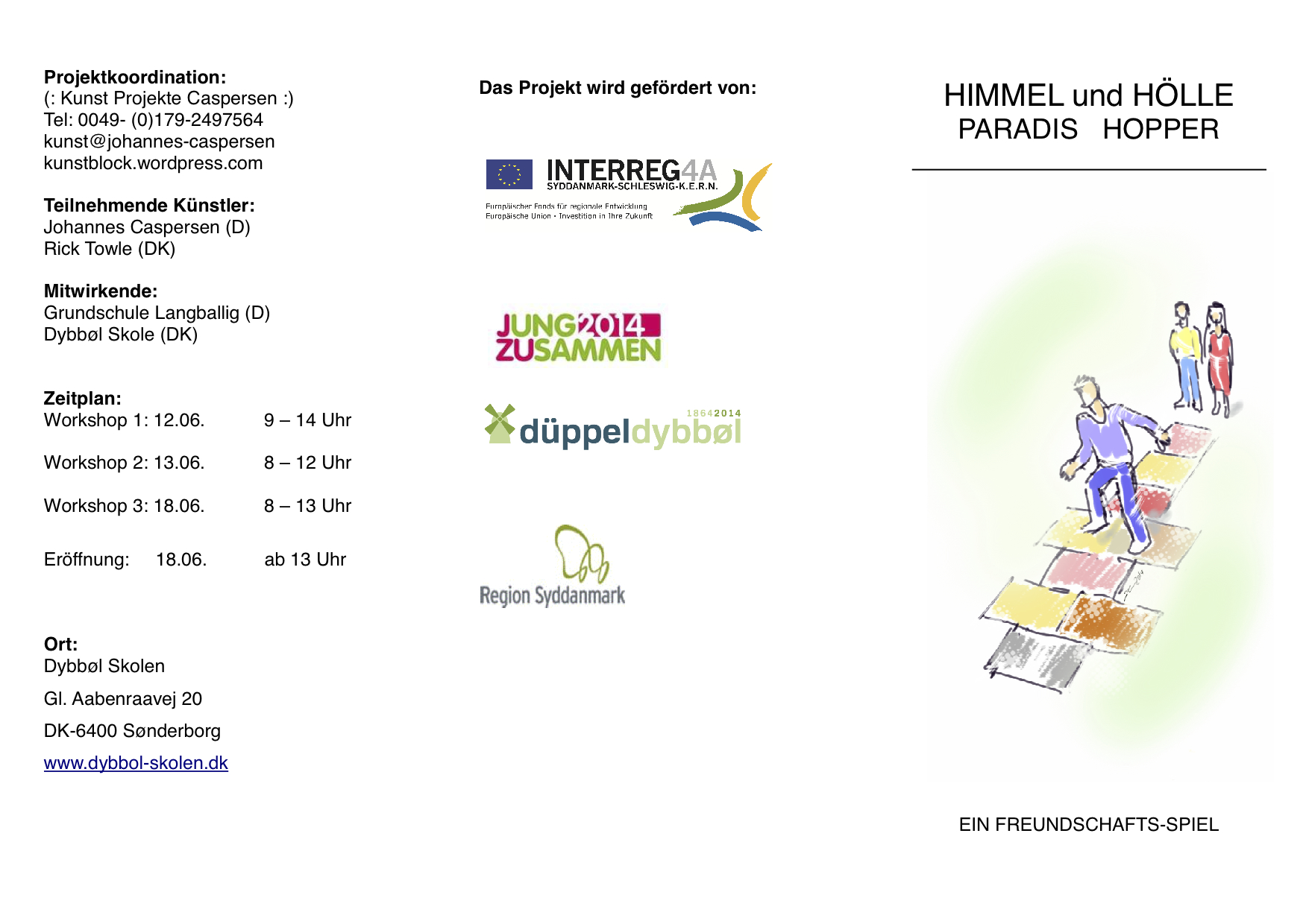 Flyer zur Kunstaktion: DüppelDybbøl 2014, „Himmel und Hölle“ vom 12.06 – 18.06.2014 von Christian Caspersen · Veröffentlicht 27. Mai 2014 · Aktualisiert 19. Dezember 2020 Dänischer und Deutscher Flyer zum ausdrucken: PARADIS HOPPER / HIMMEL & HÖLLE 3 børnekunstevents om begivenheden Dybbøl 1864-2014 PARADIS HOPPER / HIMMEL & HÖLLE 3 børnekunstevents om begivenheden Dybbøl 1864-2014 3 KinderKunstEvents zum Ereignis Dybbøl 1864 – 2014 3 KinderKunstEvents zum Ereignis Dybbøl 1864 – 2014 Link zu Projektbeschreibung: PARADIS HOPPER / HIMMEL & HÖLLE Gefällt mir:Gefällt mir Wird geladen …