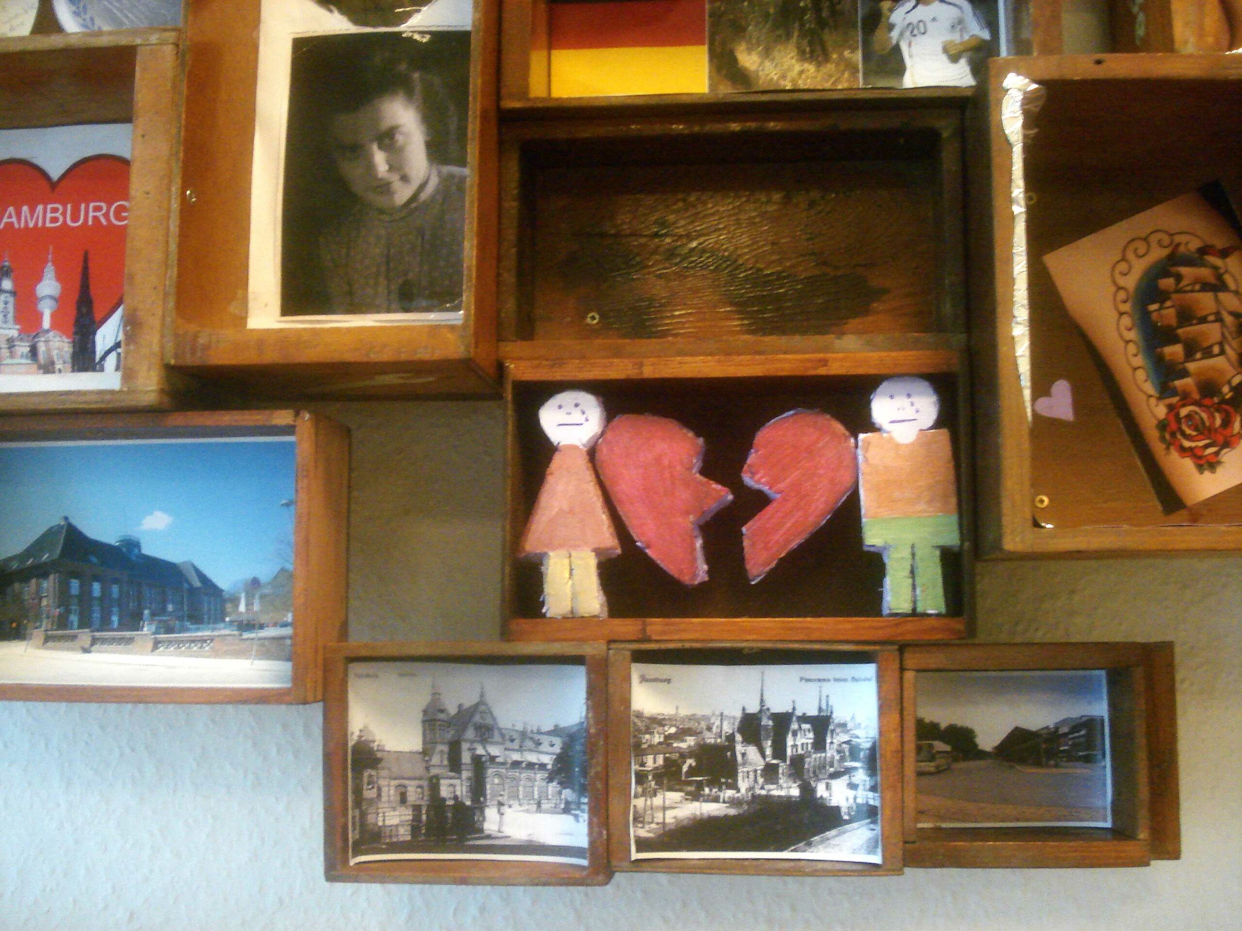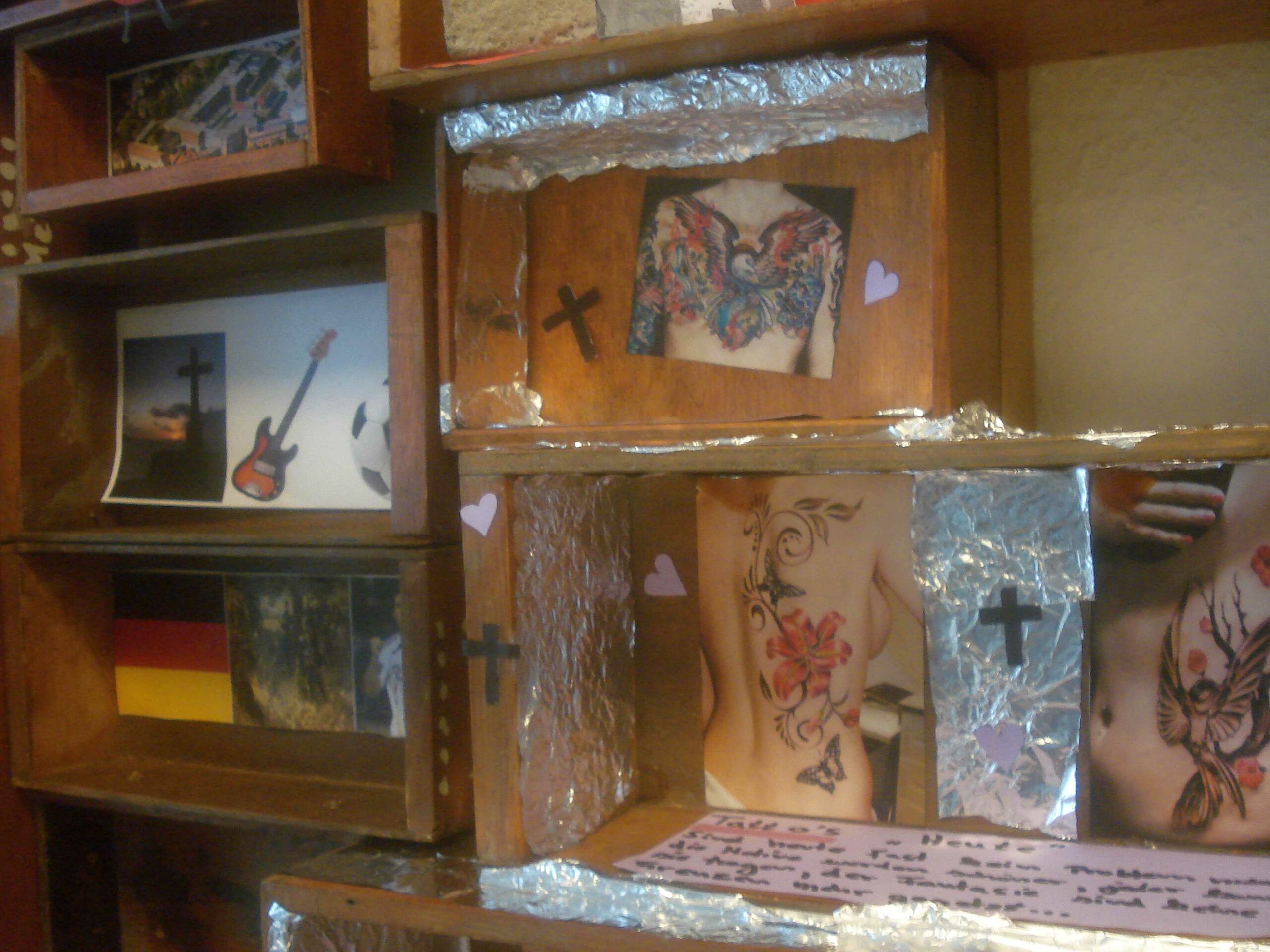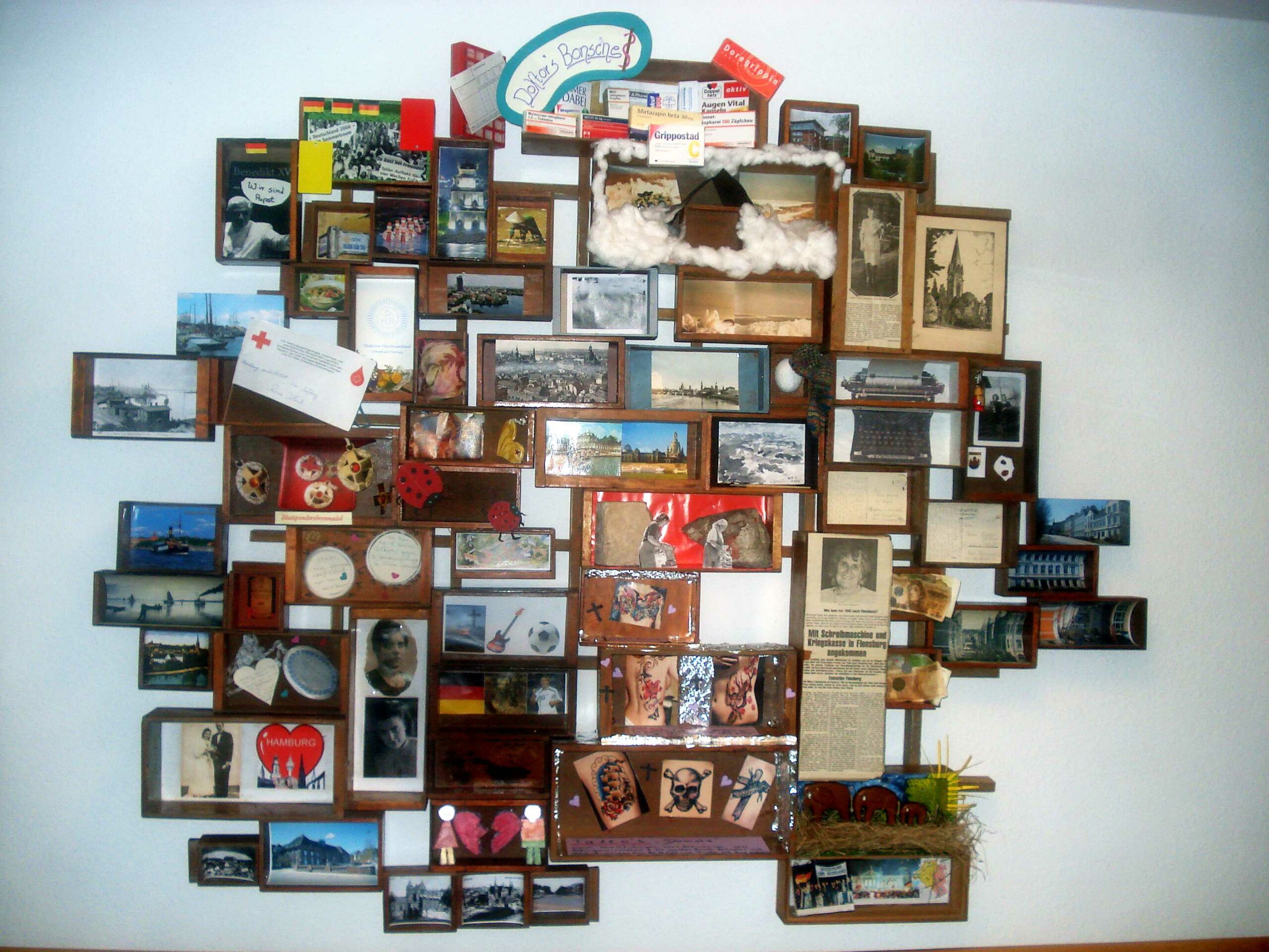 Umfangreich ist die Ausstattung der Kästen geworden. Nur noch einige sind leer. Jetzt geht es darum das Gesamtbild zu entwickeln, die Kästen zu einem Wandrelief zu fügen. Dabei wird keine chronologische Linie entstehen. Alles steht gleichberechtigt nebeneinander. Dieses Bild wird für Vielfalt stehen, für die Vielfalt der möglichen Erlebnis-Denkräume. Auch der unmittelbaren Nähe, die diese Denkräume zueinander haben. Schlussendlich jedoch bildet sich durch das endgültige Wandbild ein soziales Gefüge ab, das die Zusammenarbeit 3er Generationen veranschaulicht, die sich begegnet sind und sich im Wortsinne „mit-geteilt“ haben.