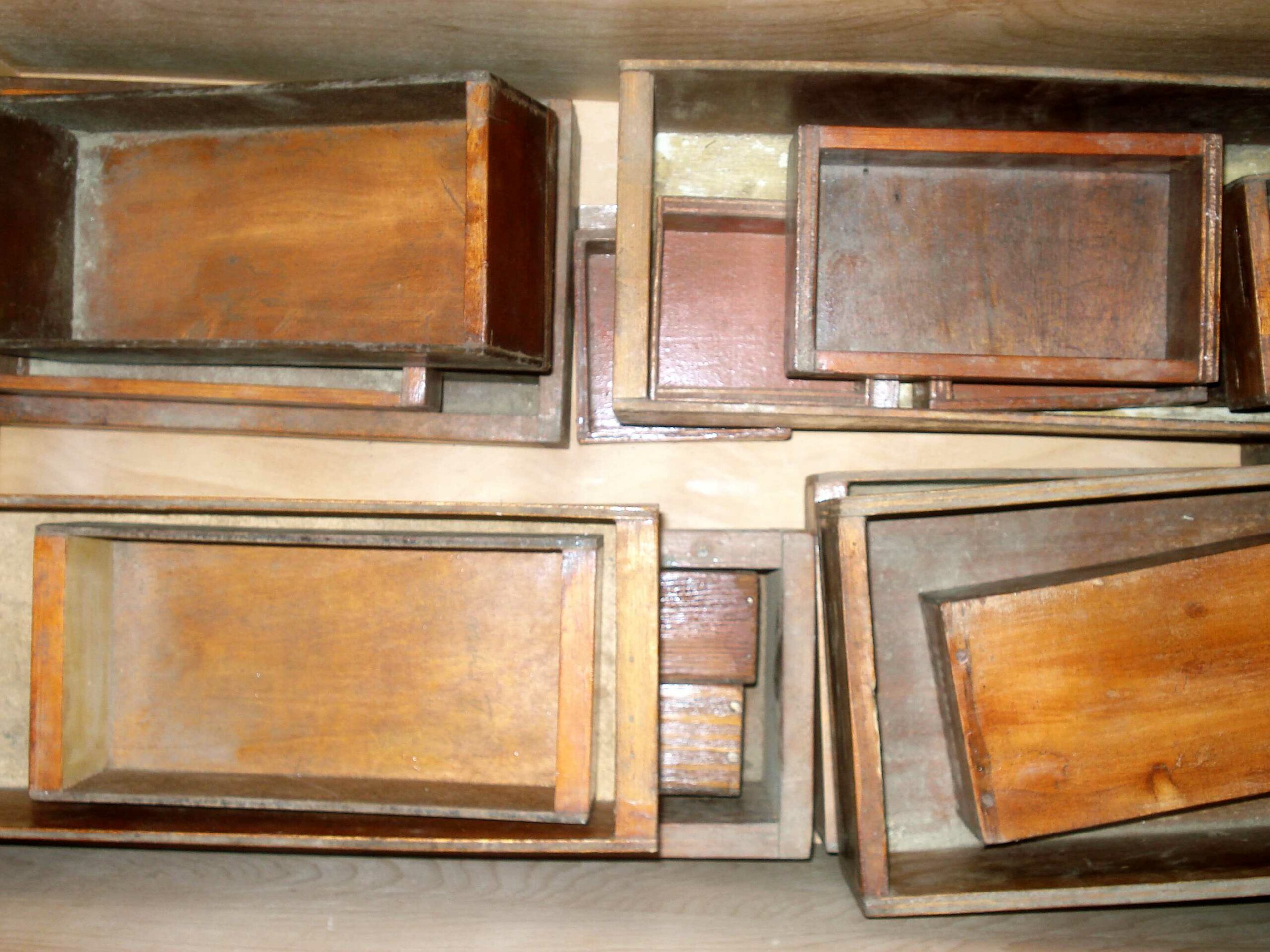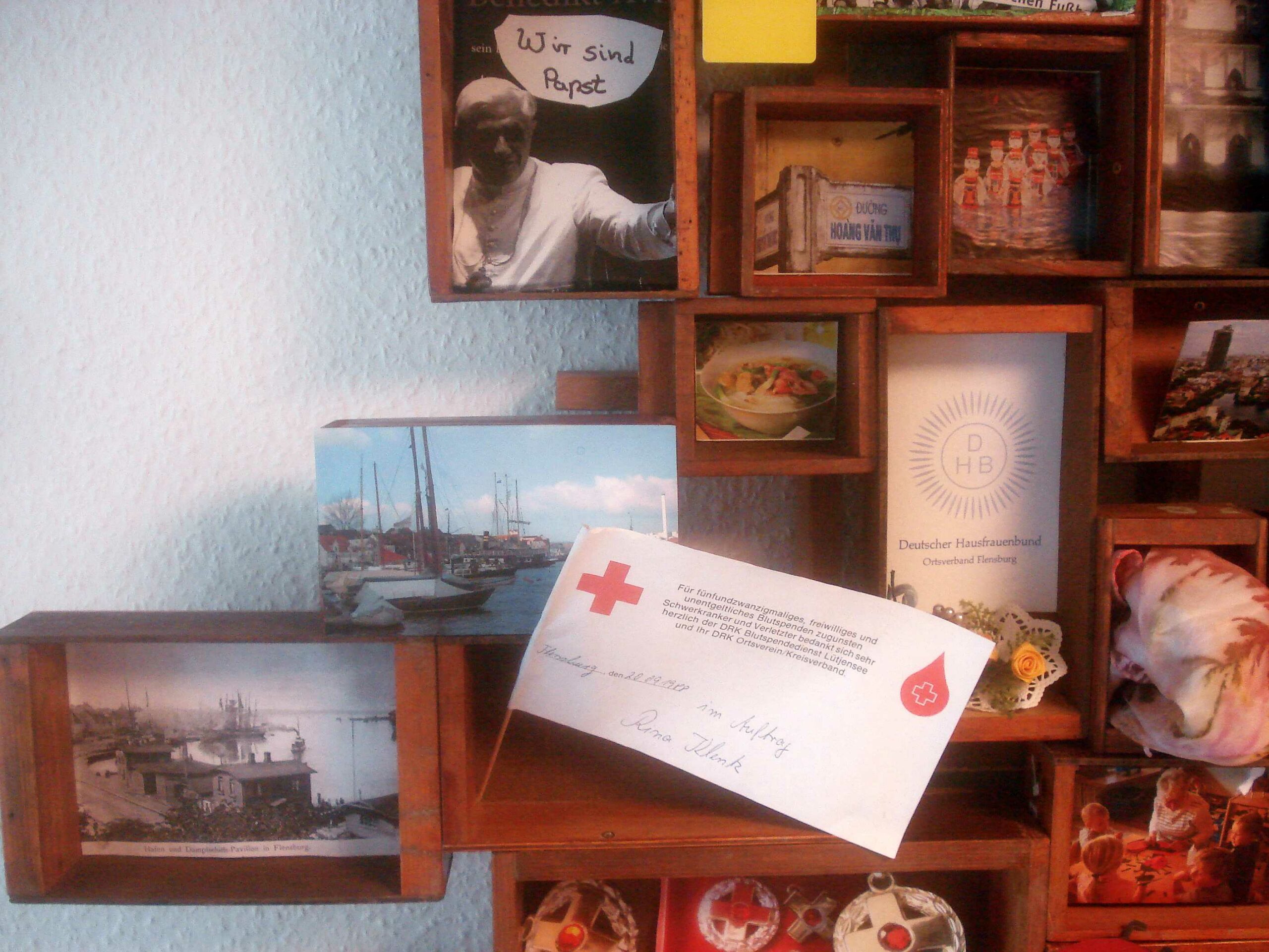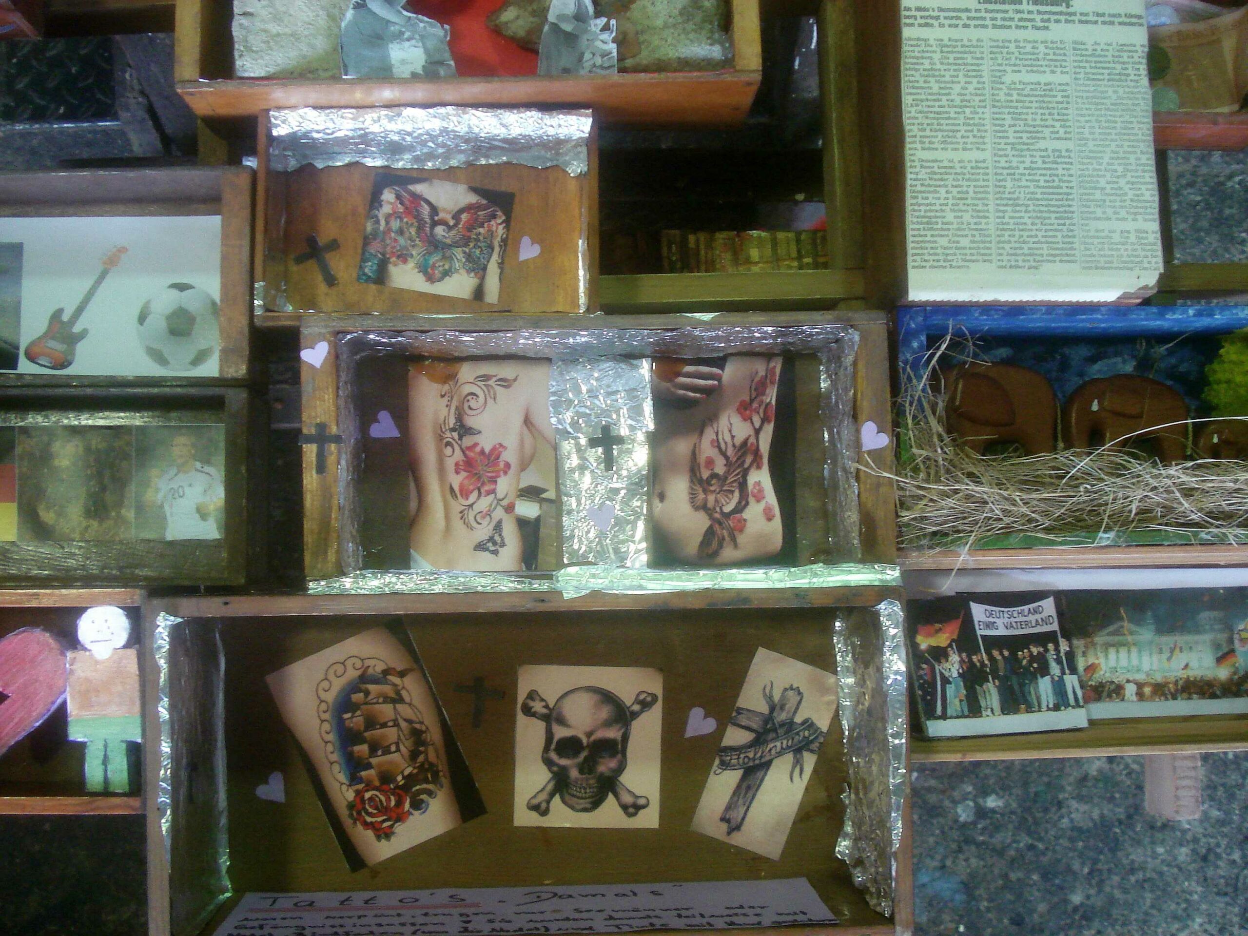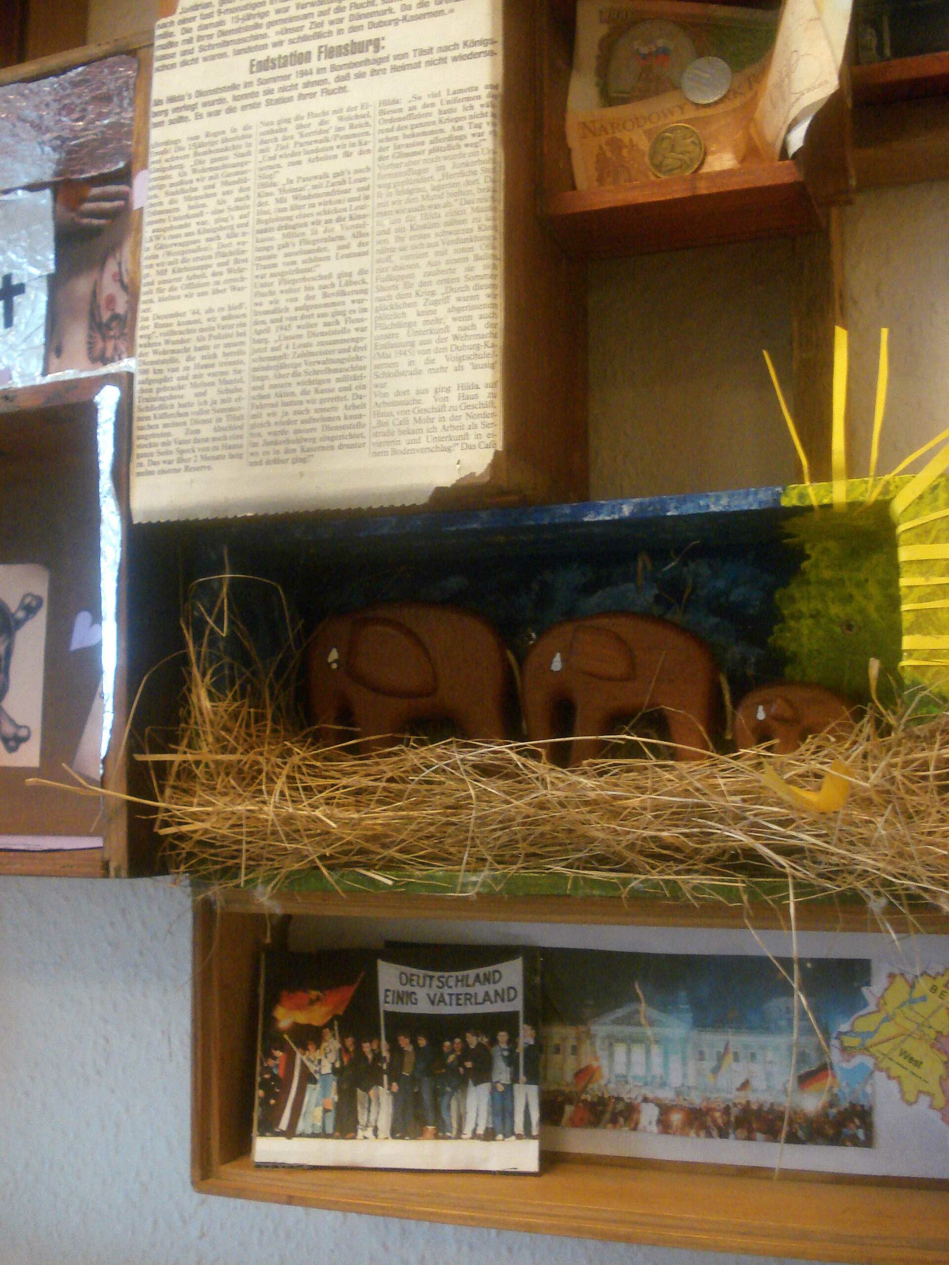 Umfangreich ist die Ausstattung der Kästen geworden. Nur noch einige sind leer. Jetzt geht es darum das Gesamtbild zu entwickeln, die Kästen zu einem Wandrelief zu fügen. Dabei wird keine chronologische Linie entstehen. Alles steht gleichberechtigt nebeneinander. Dieses Bild wird für Vielfalt stehen, für die Vielfalt der möglichen Erlebnis-Denkräume. Auch der unmittelbaren Nähe, die diese Denkräume zueinander haben. Schlussendlich jedoch bildet sich durch das endgültige Wandbild ein soziales Gefüge ab, das die Zusammenarbeit 3er Generationen veranschaulicht, die sich begegnet sind und sich im Wortsinne „mit-geteilt“ haben.