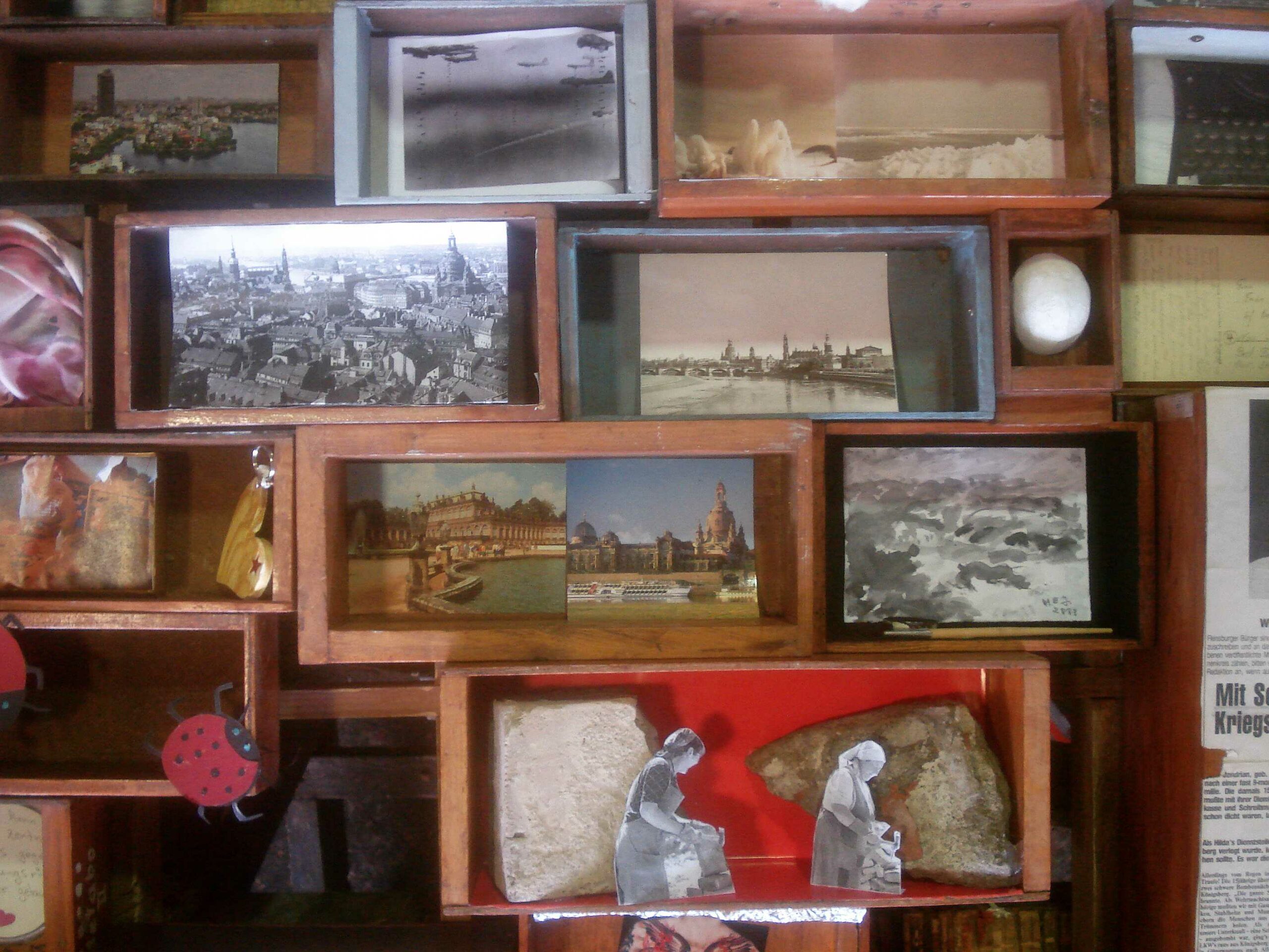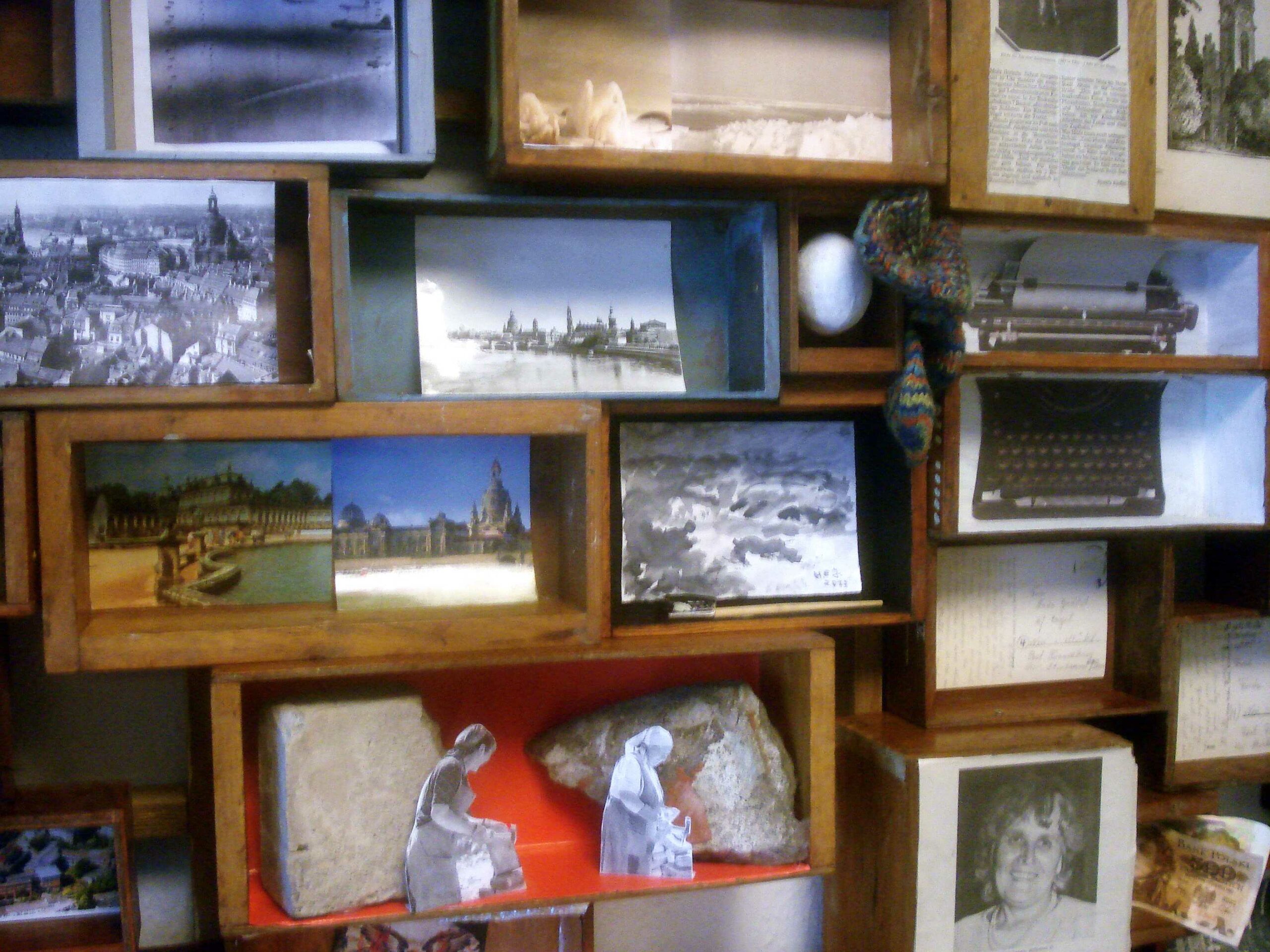 Die 12 Teilnehmer arbeiteten nicht nur jeder für sich, sondern vor allem miteinander. Es wurde bei der Recherche geholfen, es wurde sich auch privat außerhalb des Projekts getroffen um sich auszutauschen. Im Laufe der Zeit entstanden so diverse Ideen auf Grund gemeinsamer Gespräche. Am Anfang lagen 65 leere Kästen vor uns, nun sind sie fast alle gestaltet: Jeder Kasten ein Unikat,einige schnell, andere aufwendig hergestellt. Aus Kopien, Karten, Souvenirs, Fotos, Fundstücken und allerhand anderem Material. Farbe kam zum Einsatz, wie auch ein Hühnerei. Viel wurde geklebt. In einem Kasten verbirgt sich ein Leporello mit 16 Bildern zum Thema Dresden früher und heute.