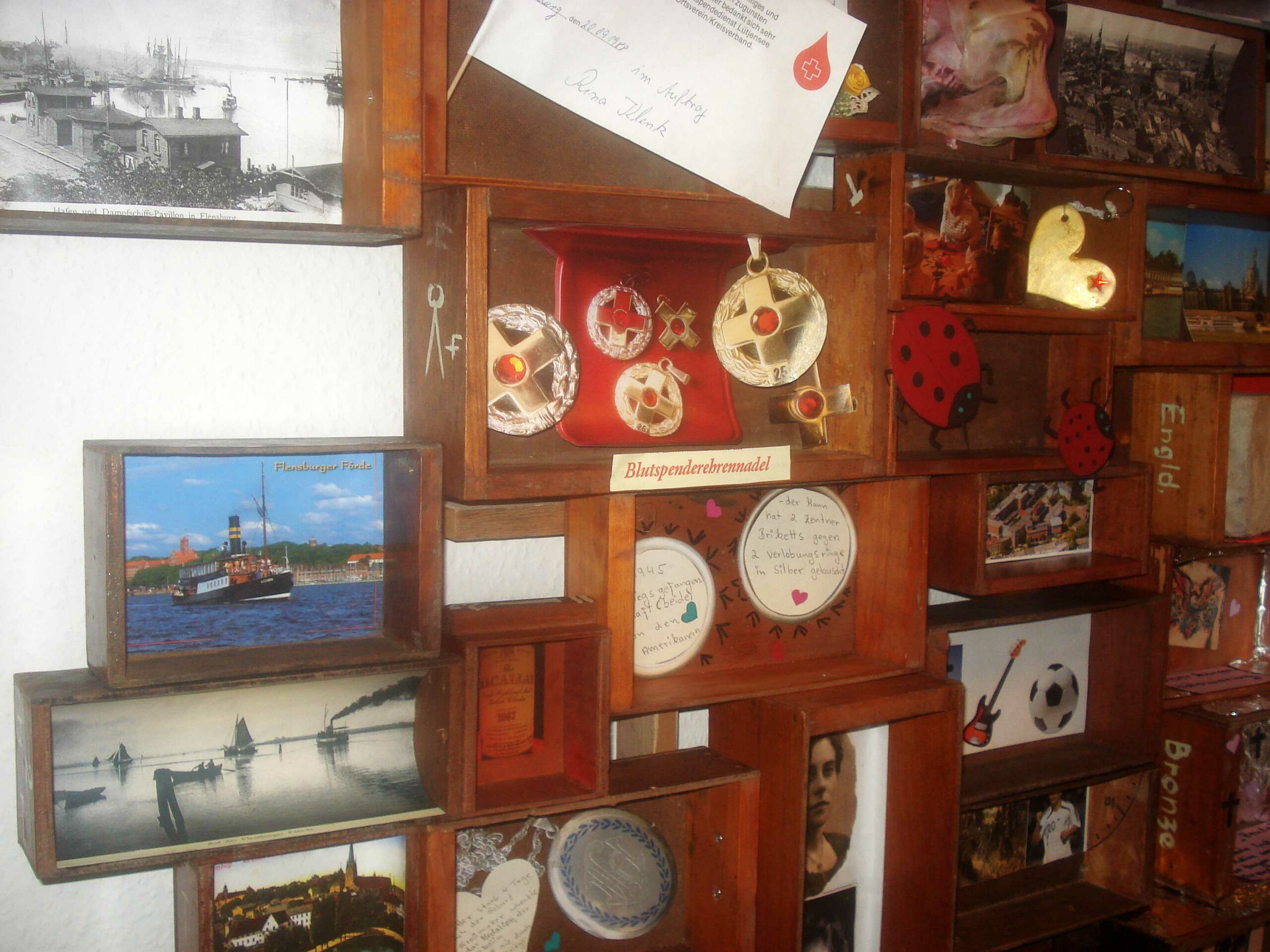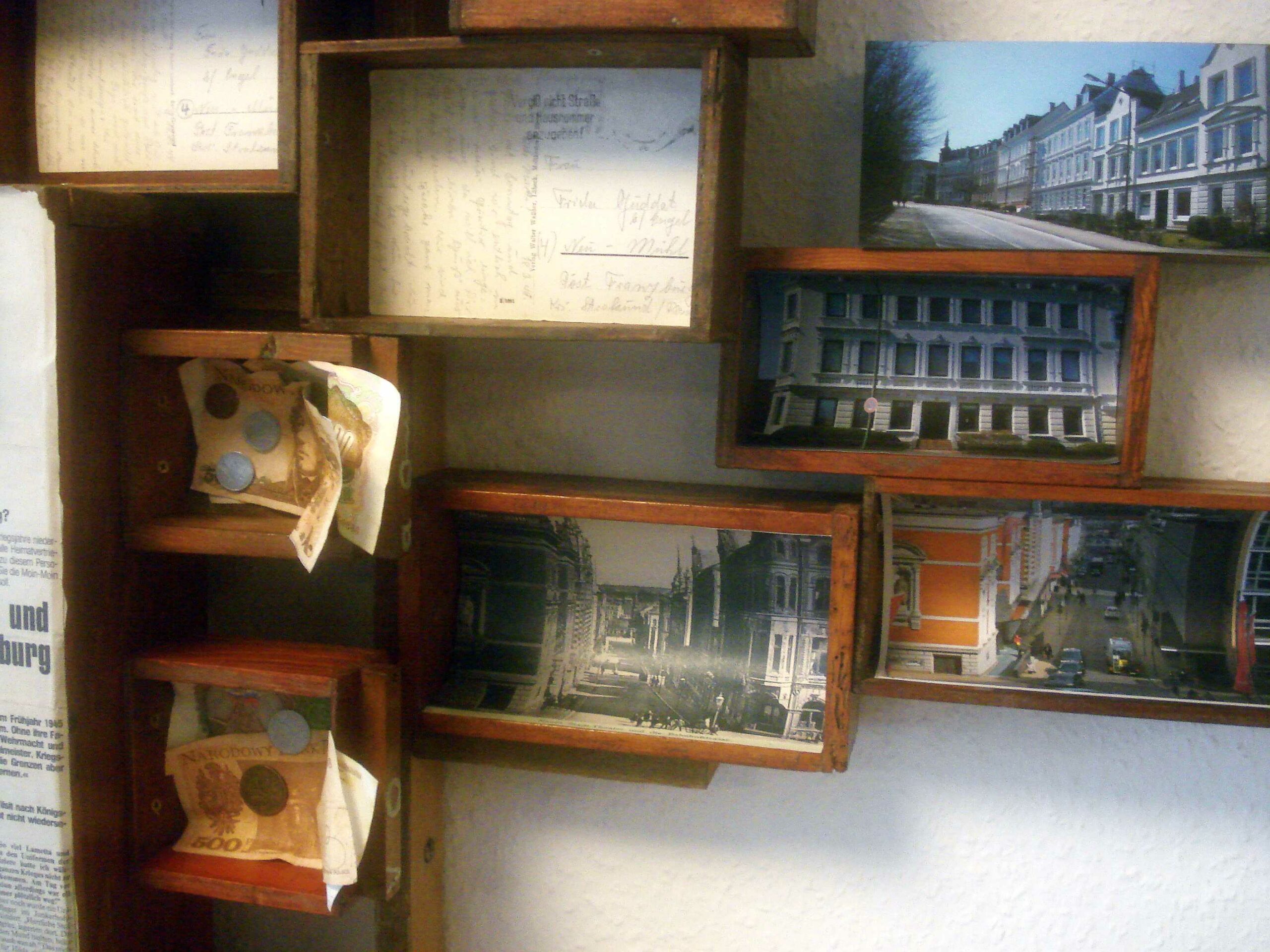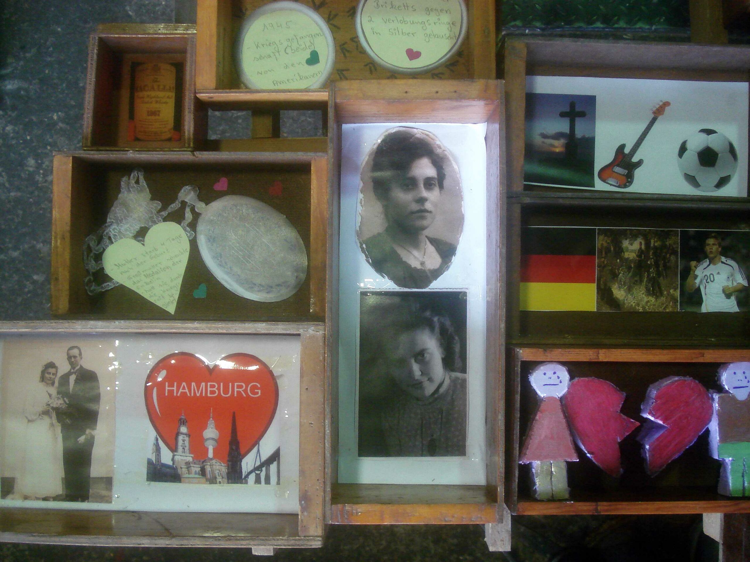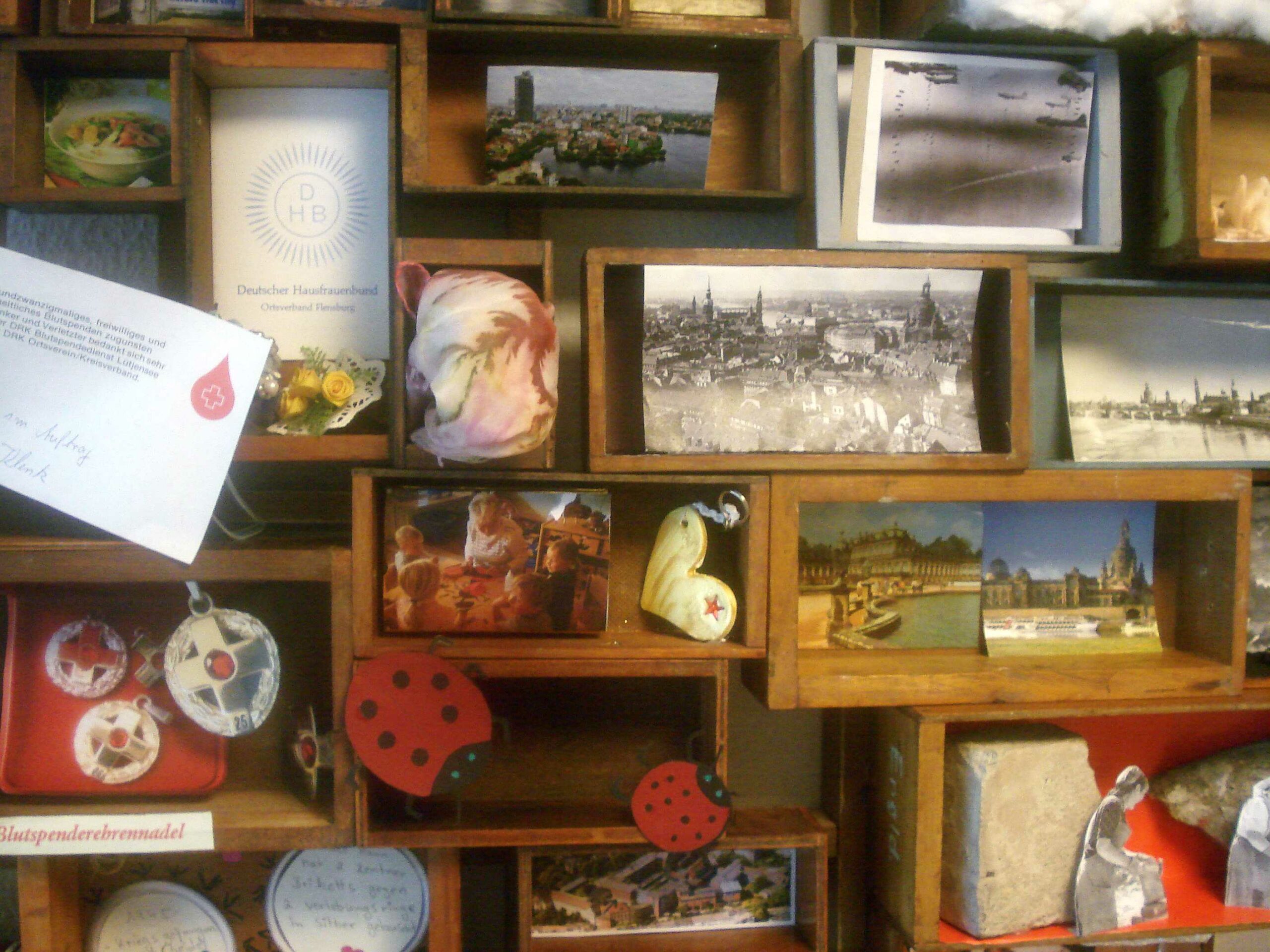 Die einzelnen, nicht genormten Kästen bekamen nun ein zweites Leben, indem sie als Behältnisse für individuelle Erlebnisse genutzt werden. Insgesamt 12 Teilnehmer bauten dahinein Anekdoten, Schicksalhaftes oder einfach Zeitgeschichtliches.