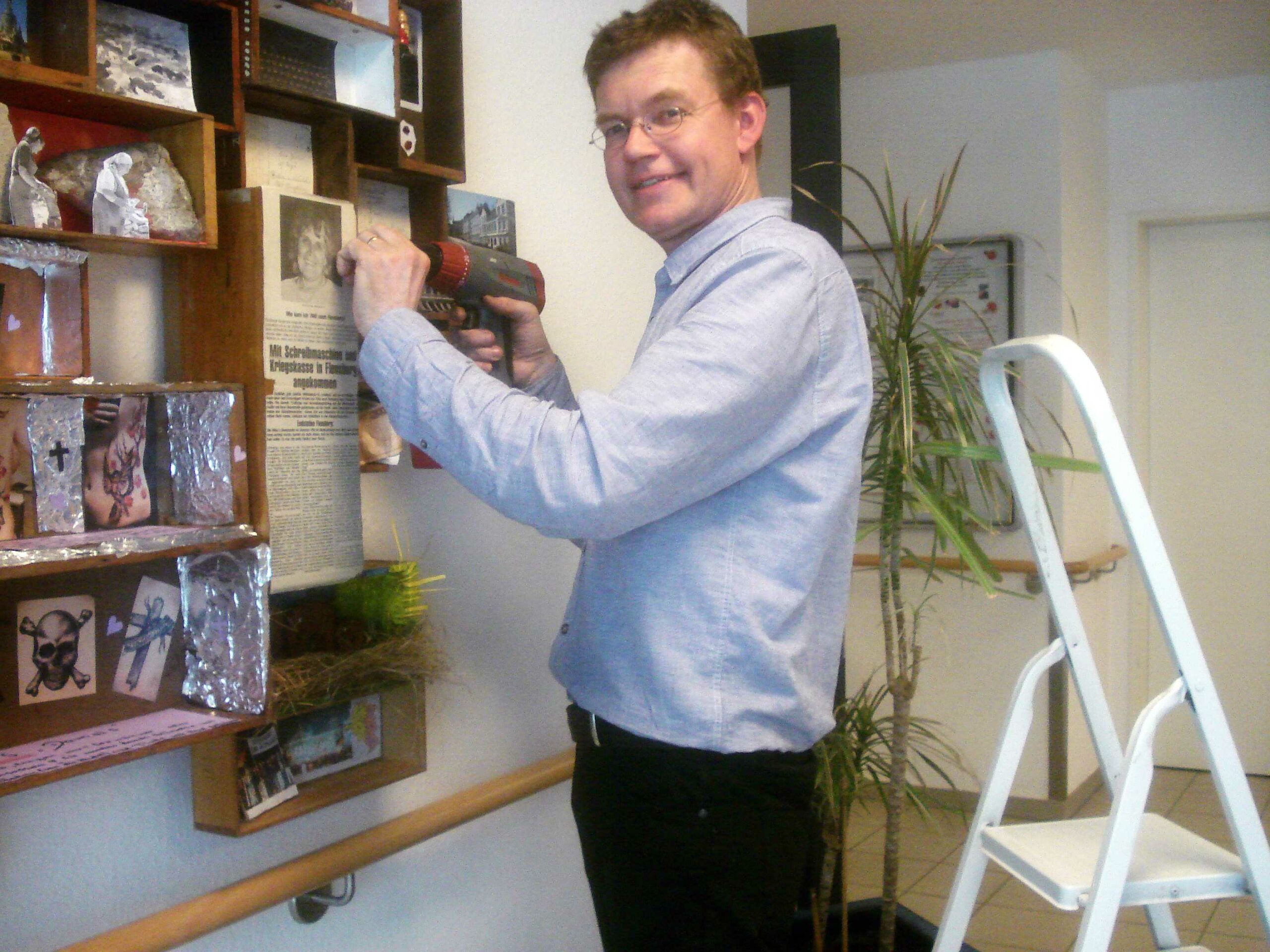Seit dem15. März wurde kontinuierlich einmal pro Woche im AWO Service Haus am Sandberg Geschichte bearbeitet. Hier trafen sich Seniorinnen, Azubis, Schüler und Schülerinnen um unter der Leitung von Johannes Caspersen Stück für Stück ein großes Wandobjekt zu gestalten. Die Basis für diese Gemeinschaftsarbeit bildeten ausgediente kleine und große Holzschubladen, die mit Zahlen, Ziffern und Zeichen versehen sind. Sie entstammen einer alten aufgegebenen Tischlerei und dienten insgesamt als Magazin für Schrauben, Nägel, Beschläge und so weiter. Haben also selbst schon Geschichte geschrieben.