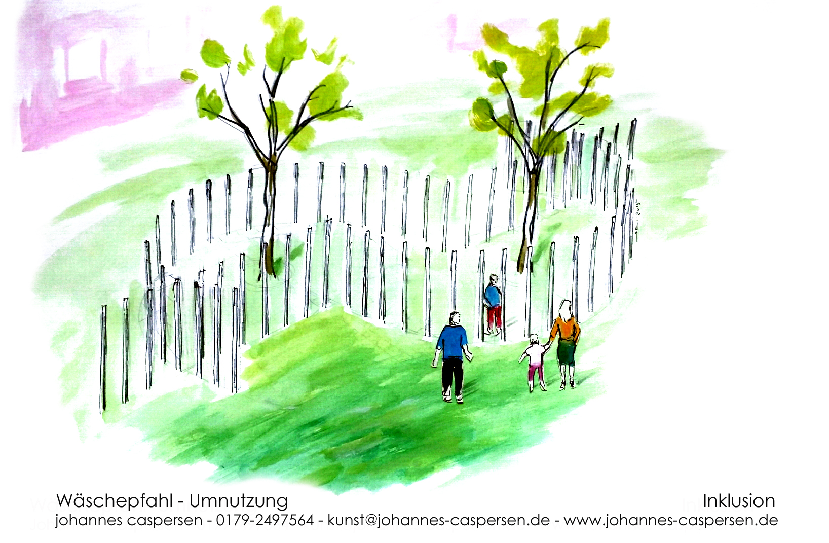 Der Wäscheplatz wird ab- und umgebaut zum Kunst- Treffpunkt. Dabei sollen die Pfähle ein Eigenleben entwickeln, das sie in andere Position rückt, aus der Erstarrung in der rechtwinkligen Feldanordnung in die freie, offene Ordnung.